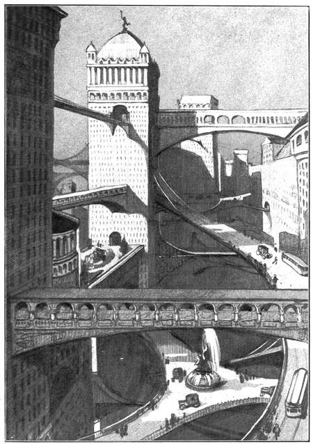 Die Straßen von jetzt werden nur die Zugangsstraßen zu dem untersten Stockwerk bilden, sofern wir nicht gar, was sehr wahrscheinlich ist, auch in die Tiefe der Erde unsere Häuser hineinbauen werden, die eigentlichen Geschäftsstraßen aber werden sich hoch oben in der Höhe der verschiedenen Stockwerke ziehen. Riesige Brücken und Bogen, mächtige Durchgänge, wundervolle Gärten und Spielplätze werden sich immer einer über dem anderen hoch und höher erheben, so hoch, daß das Auge kaum bis hinauf wird reichen können, und der ganze luftig schöne Häuserkomplex wird durch mächtige turmähnliche Bauten gestützt und gehalten werden, die zweitausend Fuß hoch und noch höher emporragen werden, und deren jeder eine Basis haben wird, die zehn, zwölf oder mehr Häuservierteln von jetzt entsprechen wird. Jedes Gebäude wird natürlich so eingerichtet sein, daß es bequem mehrere hunderttausend. Leute beherbergen kann. Die höchsten Wohnungen werden in Gärten liegen, die gleichsam im Himmel hängen, oder in großen Parkanlagen hoch oben in der klaren, kühlen, reinen Luft, und die Leute werden Expreß-Elevatoren nehmen, um nach mühevollem Tagewerk ihr Heim zu erreichen, das wirklich im luftigen, schönen Traumland der Lerchen und Nachtigallen liegen wird, dort wo die Wolken vorüberziehen und noch lange im Abendsonnenschein glühen werden, während das Dunkel der Nacht die niedrigen Stockwerke längst wird umfangen haben.