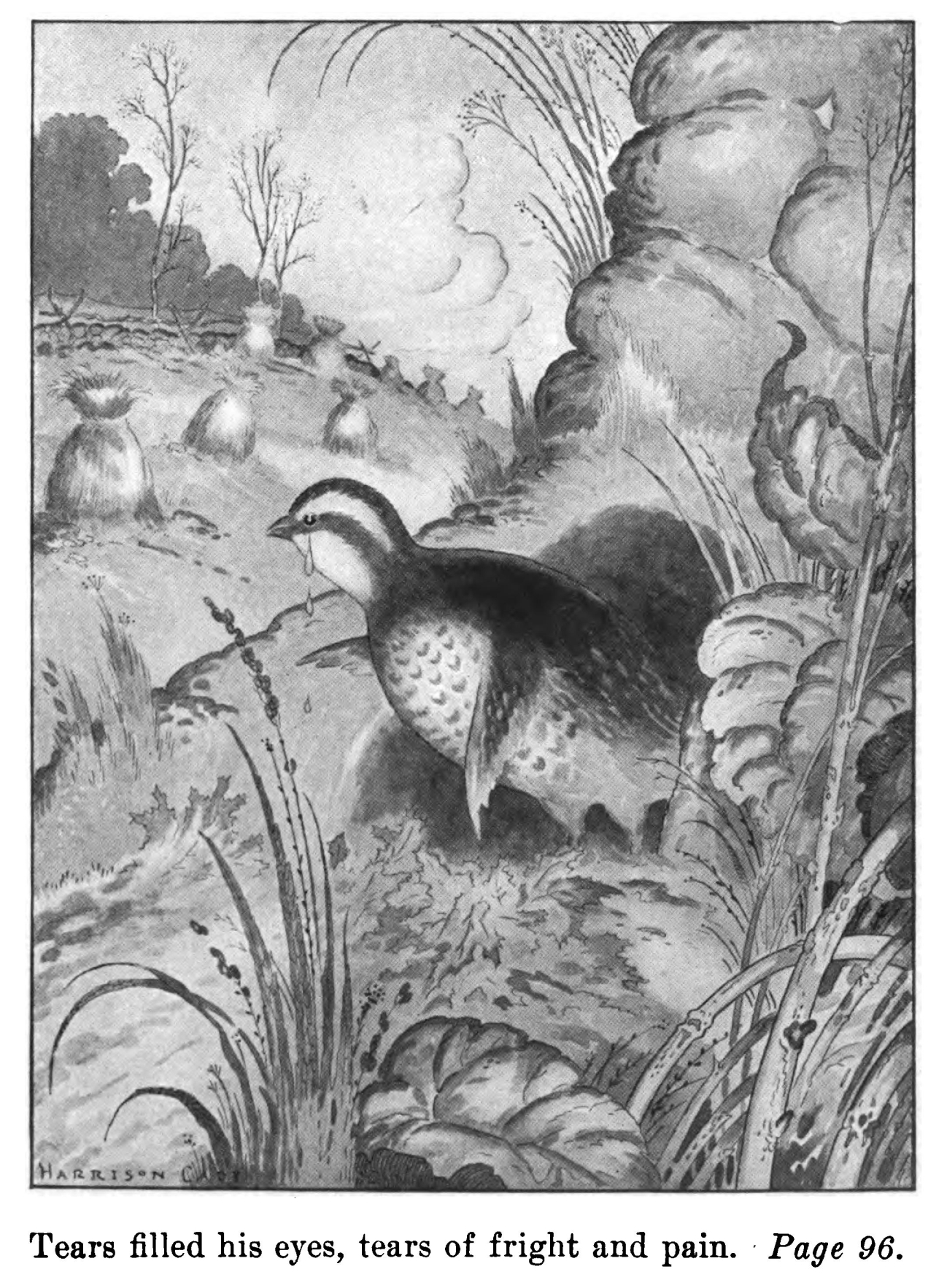 SQUATTING under the brown dead leaves which had blown into the doorway of the old house made long ago in the wheat-field of Farmer Jones by Johnny Chuck was that poor little Bob White. Tears filled his eyes, tears of fright and pain.