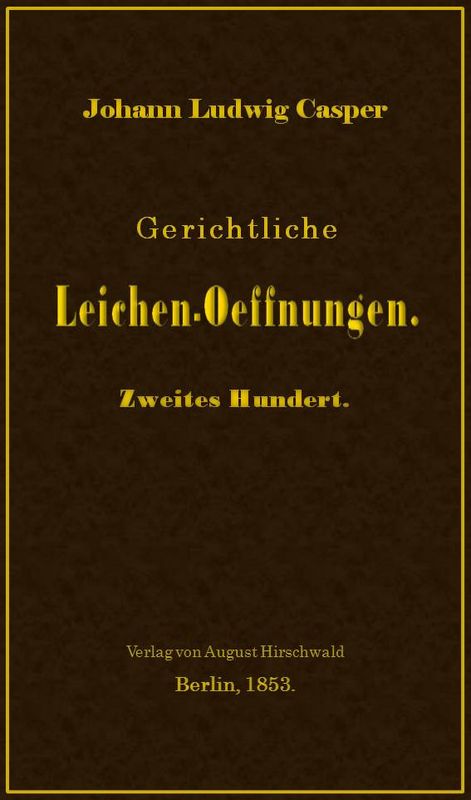 Seit dem Erscheinen der ersten Auflage des „Ersten Hundert“ meiner „gerichtlichen Leichenöffnungen“ (August 1850) ist die grosse Veränderung im Preussischen peinlichen Gerichtsverfahren eingetreten, deren nahes Bevorstehen schon damals mit Sicherheit vorausverkündet werden konnte, indem bekanntlich mit dem 1. Juli 1851 das neue Strafgesetzbuch für die Königlich Preussischen Staaten in Kraft getreten ist. Wie wesentlich überhaupt der Einfluss der, zum Theil vom ältern sehr erheblich abweichenden Bestimmungen dieses neuen Strafgesetzes auf die gerichtsärztliche Praxis, so äussert sich dieser Einfluss in keiner andern Materie mehr in die Augen springend, als gerade in Betreff der gerichtlichen Leichenöffnungen. Denn, wie bekannt, hat endlich auch bei uns die alte verrottete Lethalitätslehre ihr Ende gefunden, und wenn auch in diesem Augenblick thatsächlich noch die „Criminal-Ordnung“ und mit ihr der §. 169. mit seinen berüchtigten drei Fragen (Lethalitätsgraden) besteht, da der neue Strafprocess noch immer auf sich warten lässt, so kann doch sein Bestehen keinen praktischen Werth mehr haben. Denn wenn das Strafgesetzbuch in seinem klaren, erschöpfenden §. 185. verordnet:
