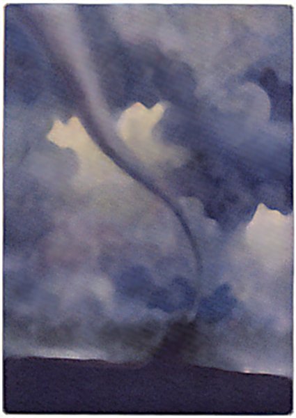 A tornado near Elmwood, Nebraska. A painting made from what is probably one of the most remarkable photographs ever taken of a tornado. The original photograph was made in two parts, as the photographer was too close to get the whole funnel cloud into the field of his camera.
