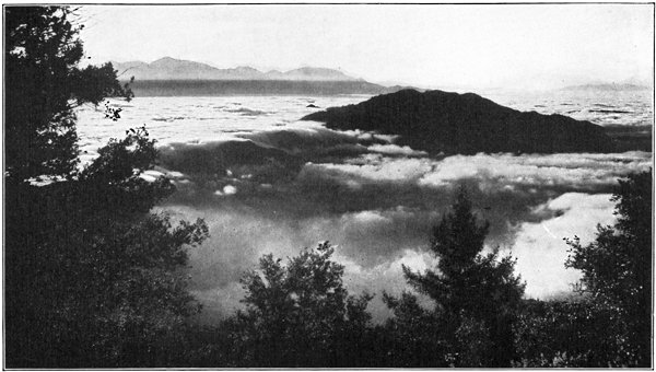 Water vapor—i. e., water in an invisible gaseous form—is always present in the atmosphere, but its amount is subject to wide fluctuations. An important fact in this connection is that, at any given temperature, the air can hold only a definite amount of this vapor. This maximum amount increases rapidly with temperature. When the air is fully charged with water vapor it is said to be “saturated.” Properly speaking, the temperature limits the amount of the vapor that can occur in a given space, regardless of the presence of the other constituents of air, and in scientific language it is the vapor itself that is said to be saturated, and not the air; but in a popular book about the atmosphere, where much has to be said about atmospheric water vapor, adherence to scientific usage in this matter invariably leads to awkward complications. Speaking, then, in familiar terms—when the air is saturated with water vapor, a fall in temperature causes some of the vapor to condense in visible form, as cloud, fog, rain, dew, snow, hail, etc. As the sole source of these various forms of moisture, and on account of the important part it plays in15 many atmospheric processes, water vapor is, from a meteorological point of view, the most interesting constituent of the atmosphere.