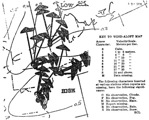 Scientific balloon ascents are no novelty. Some were made in the eighteenth century, and many famous ones in the nineteenth, including those of Biot, Gay-Lussac, Glaisher, Tissandier, and other daring savants. The “record” height for such personal ascents was attained in 1901, when Berson and Süring rose to 35,400 feet above Berlin. Kites were19 sent up for meteorological purposes even before Benjamin Franklin’s immortal experiment in 1752. Modern aerological methods have, however, little in common with these pioneer undertakings. Existing types of box kites, pilot balloons, sounding balloons, and self-registering meteorological apparatus for upper-air research were developed in the latter part of the nineteenth century, but their use did not begin to bulk large in meteorology until about the beginning of the present century. The epoch-making event in these undertakings was the discovery of the isothermal layer.