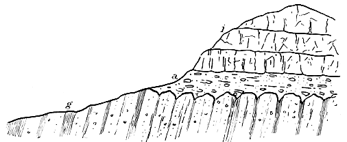 Take another example of what denuding agents have done within a recent geological period. The Faröe Islands, some twenty in number, extend over an area measuring about 70 miles from south to north, and nearly 50 miles from west to east. These islands are composed of volcanic rocks—beds of basalt with intervening layers of fine fragmental materials, and are obviously the relics of what formerly was one continuous plateau, deeply trenched by valleys running in various directions. Subsequent depression of the land introduced the sea to these valleys, and the plateau was then converted into a group of islands, separated from each other by narrow sounds and fiords. Were the great plateau through which the Colorado flows to be partially submerged, it would reproduce on a larger scale the general phenomena presented by this lonely island-group of the North Atlantic. The flat-topped “buttes” and “mesas,” and the pyramidal mountains — 40 — of the Colorado district would form islands comparable to those of the Faröes. Most of the latter attain a considerable elevation above the sea—heights of 1700, 2000, 2500, and 2850 feet being met with in several of the islands. Indeed, the average elevation of the land in this northern archipelago can hardly be less than 900 feet. The deep trench-like valleys are evidently only the upper reaches of valleys which began to be excavated when the islands formed part and parcel of one and the same plateau—the lower reaches being now occupied by fiords and sounds. It is quite certain that all these valleys are the work of erosion. One can trace the beds of basalt continuously across the bottoms, and be quite sure that the valleys are not gaping cracks or fractures. Now, as the strata are approximately horizontal, it is obvious that the hollows of the surface have nothing whatever to do with undulations produced by earth-movements. The sub-aërial erosion of the islands has resulted in the development of massive flat-topped and pyramidal mountains. These stand up as eminences simply because the rock-material which once surrounded them has been gradually broken up and carried away. Nothing can well be more impressive to the student of physical geology than the aspect presented by these relics of an ancient plateau (Plate II. Fig. 1). Standing on some commanding elevation, such as Nakkin in Suderöe, one sees rising before him great truncated pyramids—built up of horizontal beds of basalt rising tier above tier—the mountains being separated from each other by wide and profound hollows, across which the basalt-beds were once continuous. Owing to the parallel and undisturbed position of the strata, it is not hard to form an estimate of the amount of material which has been removed during the gradual excavation of the valleys. In order to do so we have simply to measure the width, depth, and length of the valleys. Thus in Suderöe, which is 19 miles long and 6 miles broad, the bottoms of the valleys are 1000 feet at least below the tops of the mountains, and some of the hollows in question are a mile in width. Now, the amount of rock worn away from this one little island by sub-aërial — 41 — erosion cannot be less than that of a mass measuring 10 miles in length by 6 miles in breadth, and 800 feet in thickness. And yet the Faröe Islands are composed of rocks which had no existence when the soft clays, etc., of the London Basin were being accumulated. All the erosion referred to has taken place since the great upheaval of the Eocene strata of the Swiss Alps.