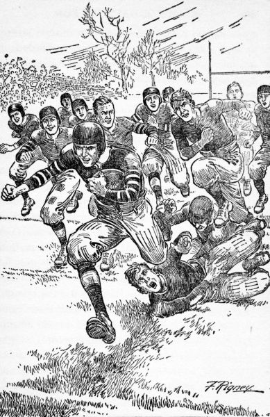 The pursuit had closed in now and foremost friend and enemy were but a few yards behind, but Dick’s speed was still to be counted on and, although his lungs hurt and his legs felt leaden, he gained at every stride and sped on and on over one white line after another. Behind him panting players surged despairingly or joyously and beside him a thunderous surge of shouts and a wild din of cheers kept pace. Then the end was in sight. Here was the ten-yard-line beneath his feet, there the last trampled yellow-white mark and the padded posts of the goal! Only a few more strides, only a few more agonising gasps for breath!