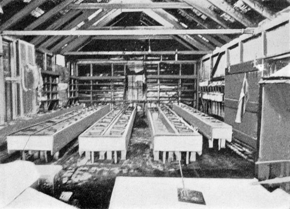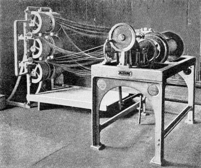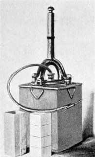 This pulping of the gun cotton not only enables one to more305 completely purify it, but it also renders it possible to mold it into convenient forms and to compress it so as to greatly increase its efficiency in use. For this purpose the pulp is suspended in water and pumped to a molding press, where, under a hydraulic pressure of one hundred pounds to the square inch, it is molded into cylinders or prisms about three inches in diameter and five inches and a half high, and these are compressed to two inches in height by a final press exerting a pressure of about sixty-eight hundred pounds to the square inch. As this is regarded as a somewhat hazardous operation, the press is surrounded by a mantlet woven from stout rope to protect the workmen from flying pieces of metal in case of an accident. The operation is analogous to that employed in powder-making, where the gunpowder has been pressed in a great variety of forms and into single grains weighing several pounds apiece.
