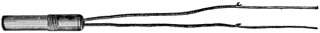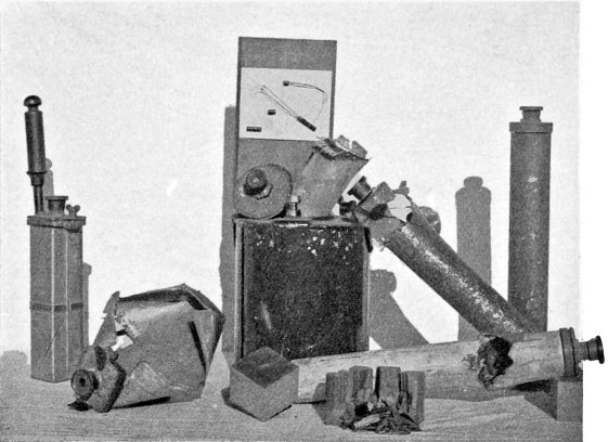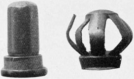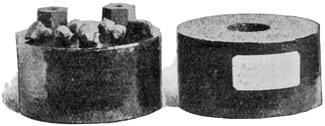 Mercury fulminate is made by dissolving mercury in nitric acid and pouring the solution thus produced into alcohol, when a violent reaction takes place and the fulminate is deposited as a crystalline gray powder. This powder is loaded in copper cases and, after drying, it is primed with dry-mealed gun cotton, the mouth of the case being closed with a sulphur-glass plug, through which pass two copper leading wires joined by a bridge of platinum-iridium wire, two one-thousandths of an inch in diameter,307 which becomes heated to incandescence when an electric current is sent through it. This device is what is known as the naval detonator. Mercury fulminate is so employed because it is the most violent of all explosives in common use, and exerts a pressure of forty-eight thousand atmospheres when fired in contact. Although the naval detonator contains but thirty-five grains of mercury fulminate, yet it will rupture stout iron and heavy tin torpedo cases when fired suspended in them, it will rend thick blocks of wood when placed in a hole and fired within them, and it will even pierce holes through plates of the finest wrought iron one-sixteenth inch in thickness if only the base of the detonator is in contact with the plate, and this has been used as a test of their efficiency. Its force is markedly shown by firing one in a stout iron cylinder filled with water and closed tightly, when the cylinder is blown into a shredded sphere. When used to detonate gun cotton, either when confined or in the open, the detonator is placed in the hole which has been molded in the center of the gun cotton disk or block, so that it shall be in close contact with the gun cotton. I have found that perfectly dry compressed gun cotton is detonated by 2.83 grains of mercury fulminate; but as a torpedo attack is necessarily in the nature of a forlorn hope and should be provided with every possible provision against failure, and since if the detonator fails the attack fails, the naval detonator is supplied with thirty-five grains, so as to give a large coefficient of assurance.