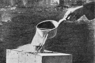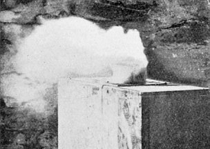 Even under the enormous pressure of the final press the compressed gun cotton still retains from twelve to sixteen per cent of water, and in this form it is quite safe to store and handle. When dry it is very combustible and burns readily306 when ignited, but it can be quenched by pouring water upon it. When confined in the chamber of a gun or the bore-hole of a rock, gun cotton will burn like gunpowder when ignited, if dry, and produce an explosion, but, in common with nitroglycerin and other high explosives, gun cotton is best exploded and develops its maximum effect when detonated, a result which is secured by exploding a small quantity of mercury fulminate in contact with the dry material.