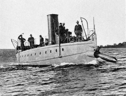 There are many types of the automobile torpedo. Among them the Hall, Patrick, Whitehead, and Howell may be cited.312 The first three are propelled by the energy resident in compressed gases; the Howell by the energy stored in a heavy fly wheel, which also, by acting on the gyroscopic principle, serves to maintain the direction imparted to the torpedo as it is launched. The Hall, Whitehead, and Howell are launched from tubes or guns by means of light powder charges, and are independent of exterior control after launching. The Patrick is launched from ways, and is controlled from the shore or boat by a wire through which an electric current may be sent to its steering mechanism. The charges are quite variable, but the war heads of the larger torpedoes contain as much as five hundred pounds of gun cotton.