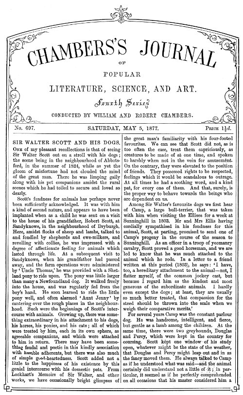 Mr Adolphus, a visitor to Abbotsford in 1830, when the health of the great writer was breaking down under his honourable and terribly imposed task-work, gives us not the least striking instance of Scott's wonderful considerateness towards animals. 'In the morning's drive we crossed several fords, and after the rain they were wide and deep. A little, long, wise-looking, rough terrier, named Spice, which ran after us, had a cough, and as often as we came to a water, Spice, by the special order of his master, was let into the carriage till we had crossed. His tenderness to his brute dependants was a striking point in the benignity of his character. He seemed to consult not only their bodily welfare, but their feelings, in the human sense. He was a gentleman even to his dogs.' When too roughly frolicsome, he rebuked them gently, so as not to mortify them, or spoil the natural buoyancy of their character.