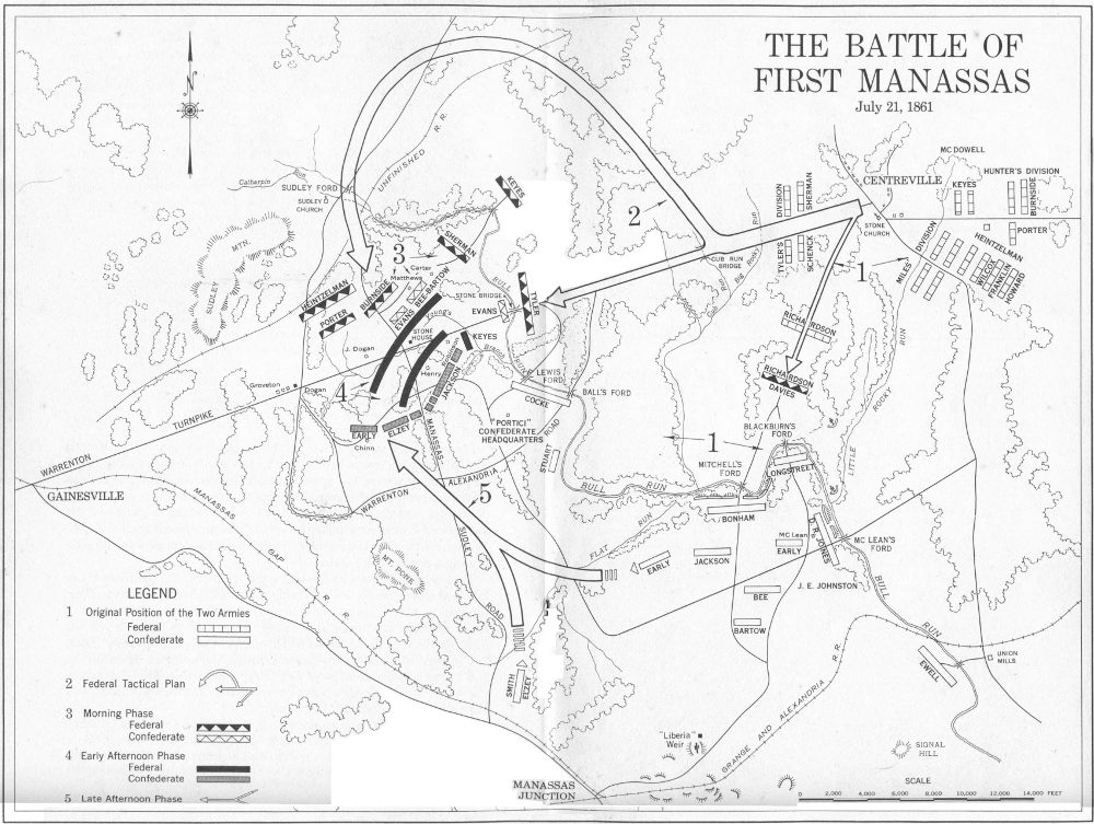 Confederate reinforcements were now steadily moving in. On the 19th, Jackson arrived 2,500 strong, having covered approximately 55 miles in 25 hours. At sunrise of the 20th, more of Johnston’s reinforcements had come in—the 7th and 8th Georgia regiments of Bartow’s brigade numbering 1,400 men. About noon, Johnston himself arrived accompanied by Bee, the 4th Alabama, the 2d Mississippi, and two companies of the 11th Mississippi. The Confederate camp now became a scene of busy activity. While the reinforcements moved up to position in the line, Beauregard and Johnston conferred on plans for an offensive. Candles burned low in headquarters that night as Beauregard and his staff put the finishing touches to the Confederate plan of attack. At 4:30 a. m., he submitted it to Johnston, his superior, for the approval that was quickly granted. The plan involved the flanking of the Federal left, but the early movement of McDowell, the delayed arrival of expected reinforcements, and the miscarriage of orders combined to prevent its execution.