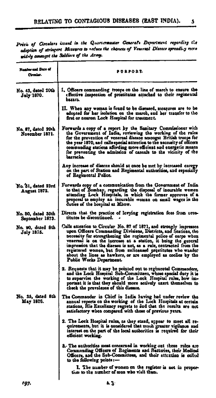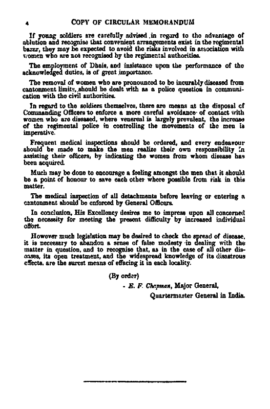 On June 17, 1886, a military order, known among the opponents of State regulation as the “Infamous Circular Memorandum,” was sent to all the Cantonments of India by Quartermaster-General Chapman, in the name of the Commander-in-Chief of the army in India (Lord Roberts). But during the course of the enquiry of the Departmental Committee of 1893, its real author was discovered to be Lord Roberts himself, not his Quartermaster-General.