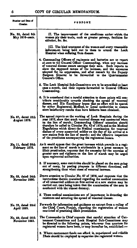 The Commander in Chief requests that careful attention of Cantonment Committees and Lock Hospital Sub-Committees may be directed to the following points, wherever free quarters for registered women have been, or may hereafter be, established:— |