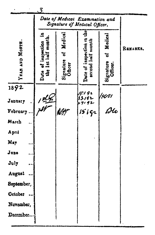 3. Such Dhais should be well paid if the fund can afford it, and they should be held responsible that:— I. The women under their charge consort with none but Europeans. II. That they do not entertain a man in any house but the one allotted them as quarters; III. That a woman is sent to hospital immediately she is found to be diseased; IV. To ensure the latter, the Dhai should examine the women daily between the periodical inspections of the medical officer. |