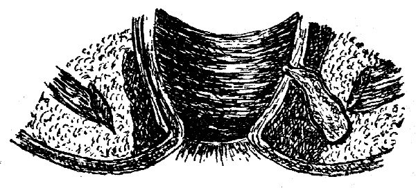 A fact to which special attention should be directed here is that small ulcerations may exist in the sinuses of Morgagni. Kelsey[19] and Vance[20] have met with such cases, the ulceration being completely hidden from sight, and detectable only by the sharp pain caused by the introduction of a small bent probe. This condition is no doubt a rare one, but is none the less important on this account, for its situation is such that it may be readily overlooked.