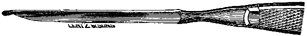 If the internal opening is more than an inch from the anus, a probe-pointed bistoury (Figs. 28, 30, p. 61) should be introduced into the fistula upon a director, and its point made to impinge upon a finger in the rectum. As the finger and the instrument are withdrawn, the necessary incision is made. Or the director can be passed through the sinus, and a wooden gorget (Fig. 35) inserted into the bowel, after which the track can be divided with an ordinary bistoury. The gorget prevents the opposite side of the bowel from being injured should the knife slip. (Fig. 36).
