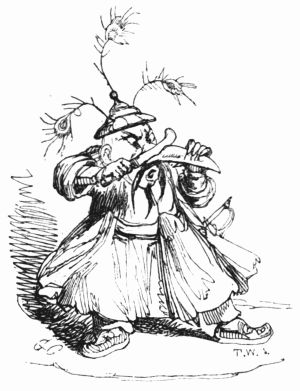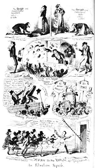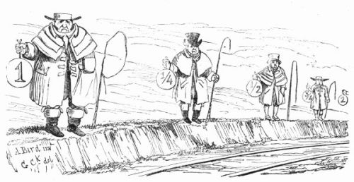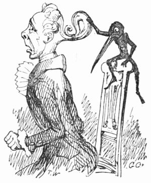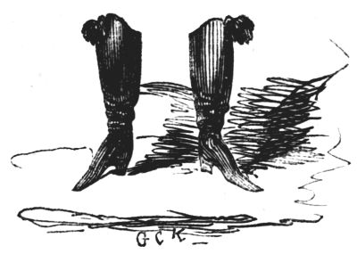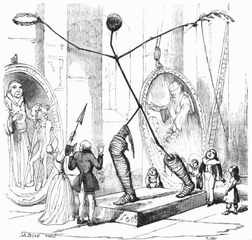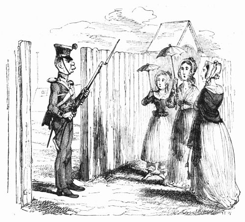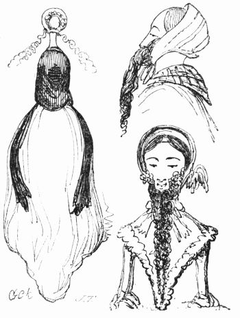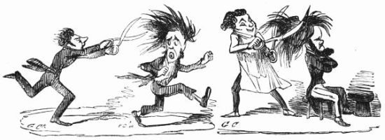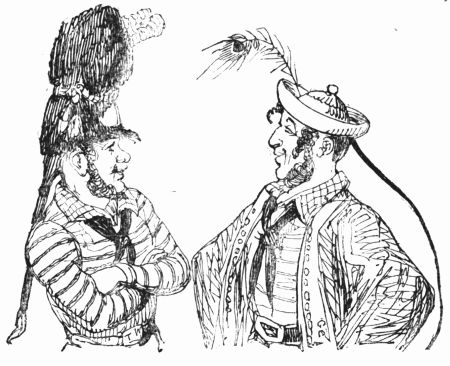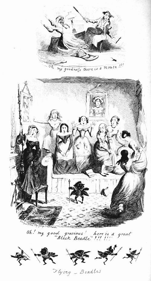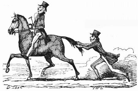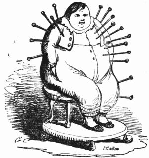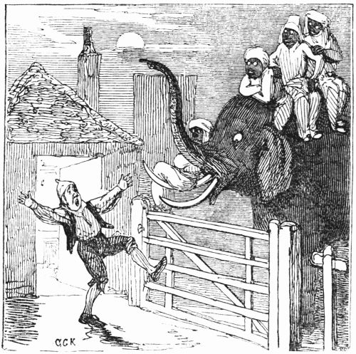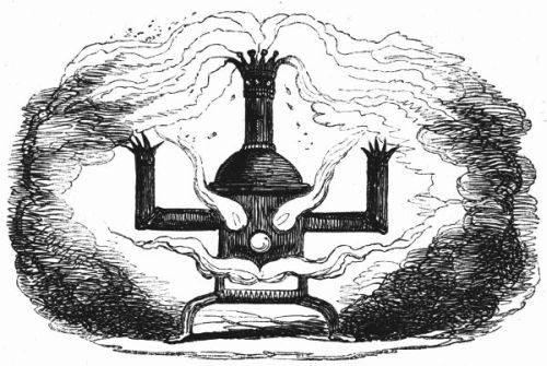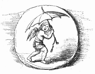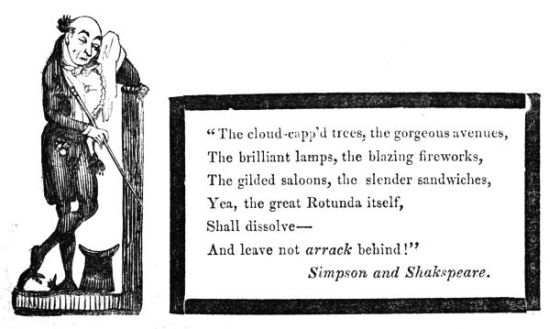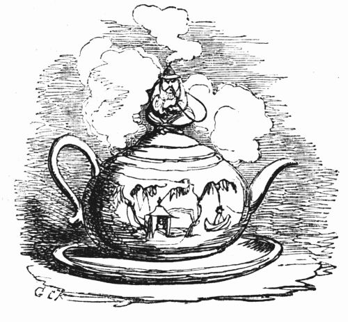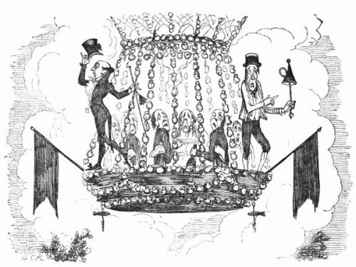 So now, my little masters and misses, have you each got your No. 1 ready? Always take care of that. Now then, please to look at the top of the circular picture which represents the world, and there you behold Her Majesty Queen Victoria on her throne, holding a court, with Prince Albert, in his field-marshal's uniform, by her side, and surrounded by ladies, nobles, and officers of state. A little to the right are the heads of the Universities, about to present an address. Above the throne you behold the noble dome of St. Paul's, on each side of which may be seen the tall masts of the British navy. Cast your eyes, my pretty dears, below the throne, and there you behold Mr. and Mrs. John Bull, and three little Bulls, with their little bull-dog; one little master is riding his papa's walking-stick, while his elder brother is flying his kite—a pastime to which a great many Bulls are much attached. Miss Bull is content to be a little lady with a leetle parasol, like her mamma. To the right of the kite you behold an armed man on horseback, one of those curious figures which, composed of goldbeater's skin, used to be sent up some years ago to astonish the natives; only they frightened 'em into fits, and are not now sent up, in consequence of being put down. And now you see "the world goes round." Turn your eyes a little to the right to the baloon and parachute, and then look down under the smoke of a steamer, and you behold a little sweep flourishing his brush on the chimney-top, and wishing perhaps that he was down below there with Jack-in-the-green. Now then, a little more to the right—where you see a merry dancing-group of our light-heeled and light-hearted neighbours, the leader of the party playing the fiddle and dancing on stilts, while one of his countrymen is flying his favourite national kite—viz., the soldier. In the same vicinity, are groups of German gentlemen, some waltzing, and some smoking meerschaums; near these are foot-soldiers and lancers supporting the kite-flyer. Now, near the horse, my little dears, you will see the mule, together with the Spanish muleteers, who, if not too tired, would like to take part in that fandango performed to the music of the light guitar. Look a little to the left, and you behold a quadrille-party, where a gentleman in black is pastorale-ing all the chalk off the floor; and now turn your eyes just above these, and you behold a joyful party of convivialists, with bottles in the ice-pail and bumpers raised, most likely to the health of our gracious Queen, or in honour of the Great Captain of the Age. And now, my little dears, turn your eyes in a straight line to the right, and you will perceive St. Peter's at Rome, beneath which are two young cardinals playing at[x] leap-frog, not at all frightened at the grand eruption of Mount Vesuvius which is going on in the distance. From this you must take a leap on to the camel's back, from which you will obtain a view of the party sitting just below, which consists of the grand Sultan smoking desperately against Ali Pacha. Now, look a little lower down, and you will see a famous crocodile-catcher of the Nile, said to bear a striking resemblance to Commodore Napier; and now, look upwards again to the farthest verge, and you behold the great Pyramid, and a wild horseman chasing an ostrich not so wild as himself. Now, the world goes round a little more, and you see some vast mountains, together with the temples of Hindostan; and upon the palm-tree you will find the monkeys pulling one another's tails, being very uneducated and having nothing else to do: here, also, you will discern the Indian jugglers, one throwing the balls, and another swallowing the sword, a very common thing in these parts. And now, my little dears, you can plainly see several very independent gentlemen and loyal subjects standing on their heads in presence of the Emperor of ever so many worlds, and the brother of the sun and moon; and behind these, hiding the wall of China, you will see a quantity of steam, (for they are in hot water there,) that issues from the tea-kettles. Leaving his Celestial Majesty smoking his opium, and passing the junks, temples, and pagodas, you see a Chinese joss upon his pedestal; and now you can descend and join that pretty little tea-party, where you will recognise some of your old acquaintances on tea-cups; only, if you are afraid of the lion which you see a long way off, you can turn to the left, and follow the tiger that is following the elephant like mad: and now, my little dears, you can jump for safety into that palanquin carried by the sable gentry, or perhaps you would join the party of Persians seated a little lower, only they have but one dish and no plates to eat out of. Just above this dinner-party you behold some live venison, or a little antelope eating his grass for dinner while a boa-constrictor is creeping up with the intention of dining upon him; so you had better make your way to that giraffe, who is feeding upon the tops of trees, which habit is supposed to have occasioned the peculiar shape of that remarkable quadruped; and now you fall again in the way of that ramping lion, from whose jaws a black is retreating only to encounter a black brother more savage than the wild beast. And now, if your eye follows that gang of slaves, chained neck to neck, who are being driven off to another part of the world, you will see what treatment they are doomed to experience there, in the flogging which is being administered to one of their colour—that is to say, black as the vapour issuing from that mountain in the distance; it is Chimborao, or Cotapaxi, I can't say exactly which, but it shall be whichever you please, my pretty little dears. In the smoke of it an eagle is carrying off a lamb—do you see?—Stop, let me wipe the glasses!—Ah, yes, and now you can clearly behold a gentleman of the United States smoking his cigar in his rocking-chair. A little behind is another gentleman driving hi