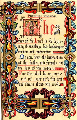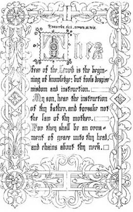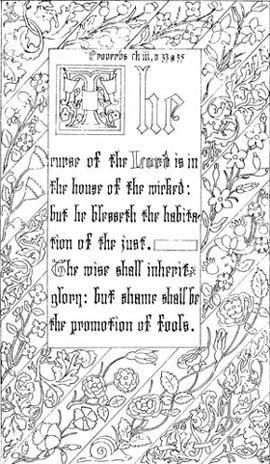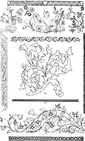[E] Some eminent writer on "ornamental art" strongly objects to introduce "casting shadows" in ornamentations, or in other words bringing out objects in "relief,"—he argues, with some apparent plausibility, that if treading on a carpet, where flowers or scrollwork were introduced, he should be afraid of crushing the flowers, or stumbling over the ornamentations. I know not which to admire most, the pedantry of modern philosophy on art, or the actual beauty displayed in the "Old Missals," in which these charming "casting shadows" present such bewitching reality to the imagination. I leave the question to be answered by the untutored beholder, without venturing on any theory of my own.