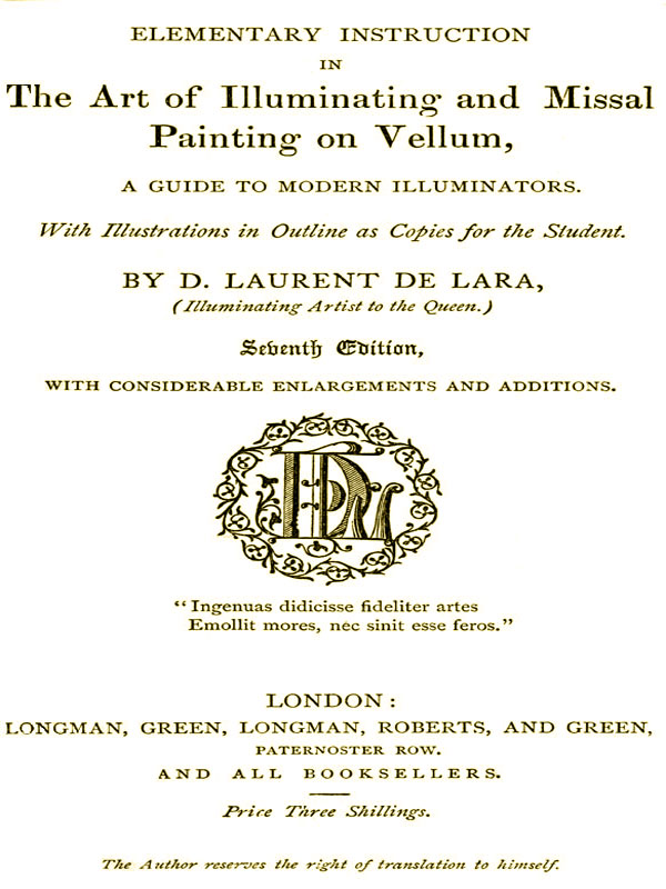[D] I have prepared a variety of drawings of initial letters, and classical borders both on vellum and cardboard, with accompanying outlines of the same, very faintly lithographed, on super-fine drawing-boards which may be purchased for a trifling expense at most art repositories and booksellers. The illuminations may also be purchased, or are lent on hire, for the purposes of copying. These are executed under my direction and superintendence, by my numerous pupils, who now follow out the art as a lucrative profession. As the student will obtain better and more accurate ideas of copying from drawings than from prints, I have, at the suggestion of many of my friends, adopted this plan of supplying the amateur artist with an illuminated copy, and its outline, which he may easily fill up according to his own taste, or strictly follow the original: the encouragement this suggestion has received from the public has tended to confer a great boon on a worthy class of female artists, who have been zealous and successful in a beautiful branch of female accomplishment.