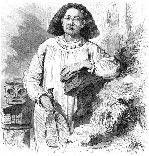 Le lendemain de grand matin, je quittai Nuka-Hiva pour n'y plus revenir, et sans savoir si la souveraine était allée rejoindre les vieux rois tatoués ses ancêtres.