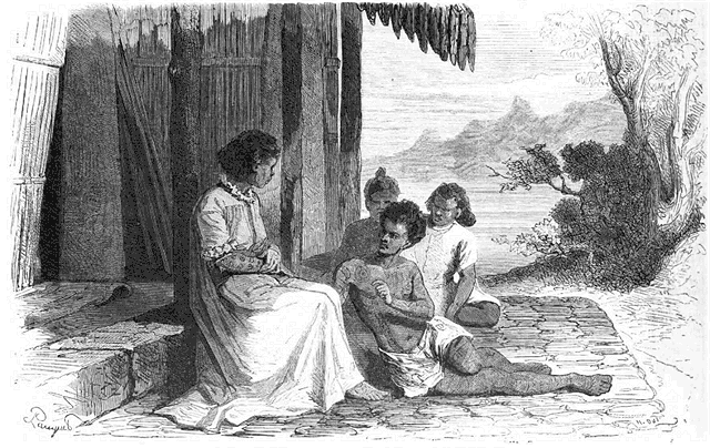 Vaékéhu était étendue à terre et tordait ses bras tatoués avec toutes les marques de la plus vive souffrance; ses femmes, accroupies autour d'elle, avec leurs grands cheveux ébouriffés, poussaient des gémissements et menaient deuil (suivant l'expression biblique qui exprime parfaitement leur façon particulière de se lamenter).