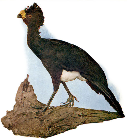 The Curassows belong to the order of Gallinaceous birds and bear the same relation to South America that the pheasants and grouse bear to the Old World. They are in every respect the most important and the most perfect game birds of the district which they inhabit. In all there are twelve species placed under four genera. As the hind toes of the feet are placed on a level with the others they resemble the pigeon and are unlike many of the other gallinaceous birds.