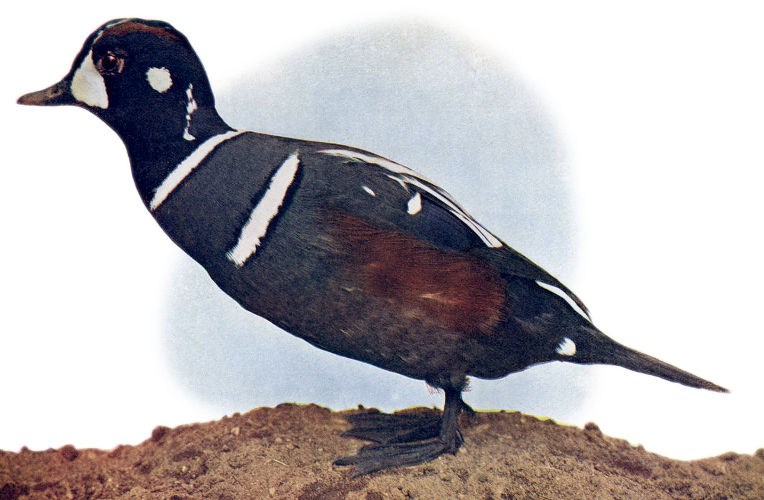 Harlequin is not the only name by which this bird is known. In the New England States and northward along the Atlantic coast it is frequently called the “Lord and Lady,” because of the white crescents and spots of its plumage and the proud bearing of the male. It is also called the Rock Duck, the Mountain Duck and the Squealer.