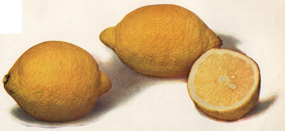 The varieties of Lemons are distinguished chiefly by their size and form, and may be roughly classified as egg-shaped with blunt nipples and oblong lemons with large nipples. The sweet lemon and thin-rind Poncine and Naples belong to the first class, while the second includes such forms as the imperial, the Gaëta and the wax. The principal varieties grown in California are the Lisbon, Eureka and the Villa-Franca. Of these, the Eureka originated in California, while the Villa-Franca was imported from Europe. Besides the grateful quality of the juice, the expressed oil of the rind is used in the arts and has an intense odor of lemon, and the Pundits of Benares, quote a Sanskrit work, written about 1354, in which the oil is described as a valuable medicine. The acid pulp of the Lemon, after rasping off the rind, is pressed for citric acid, while the ottos of the Lemon, orange and bergamot, the preparation of which forms the chief industry of Sicily, are leading ingredients in the preparation of “Lisbon Water” and “Eau de Portugal.”