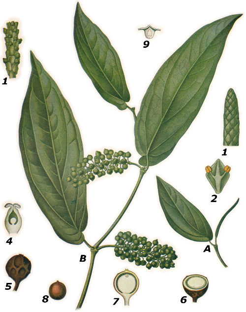 The cubeb-yielding plant is not unlike the pepper plant and belongs to the same family (Piperaceae). The two resemble each other in general habits in the form of inflorescence and in the fruiting.