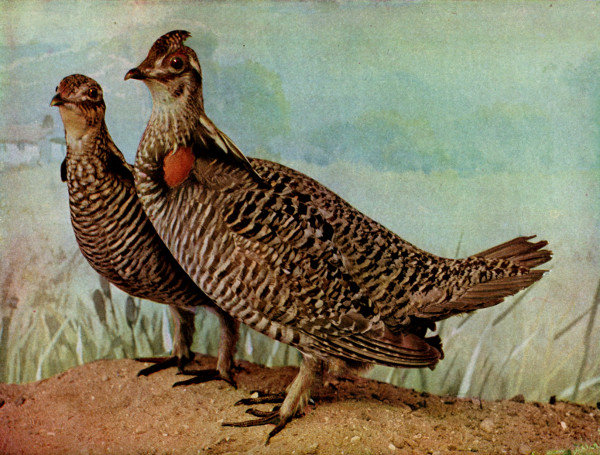 NUTTALL says that, choosing particular districts for residence, this species of Grouse is far less common than its Ruffed relative. It is often called Prairie Chicken and Pinnated Grouse. Confined to dry, barren, and bushy tracts of small extent, these birds are in many places now wholly or nearly exterminated. They are still met with on the Grouse plains of New Jersey, on Long Island, in parts of Connecticut, and in the Island of Martha's Vineyard. Mr. Nuttall was informed that they were so common on the ancient bushy site of the city of Boston that laboring people or servants stipulated with their employers not to have the Heath Hen brought to table oftener than a few times in the week. They are still common in the western states, but thirty years ago we saw vast numbers of them on the plains of Kansas. As there were no railroads then, they could not be sent to market, and were only occasionally eaten by the inhabitants. The immense wheat fields which have been sown for a number of years past have largely increased this species, where they assemble in flocks, and are the gleaners of the harvest.