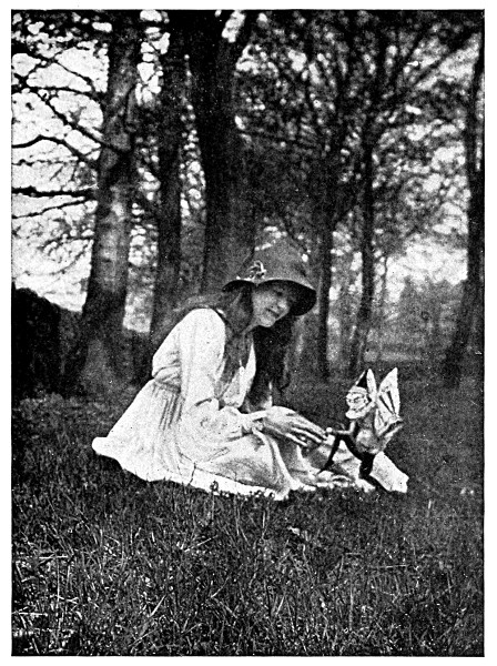 Photograph taken by Frances. Fairly bright day in September, 1917. The "Midg" camera. Distance, 8 ft. Time, 1/50th sec. The original negative has been tested, enlarged, and analysed in the same exhaustive manner as A. This plate was badly under-exposed. Elsie was playing with the gnome and beckoning it to come on to her knee.