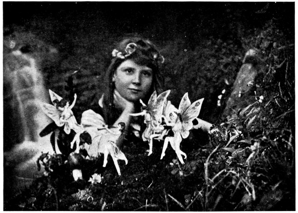 "I wish you could see a photo he has. He believes in fairies, pixies, goblins, etc.—children, in many cases, really see them and play with them. He has got into touch with a family in Bradford where the little girl, Elsie, and her cousin, Frances, constantly go into woods and play with the fairies. The father and mother are sceptical and have no sympathy with their nonsense, as they call it, but an aunt, whom Edward has interviewed, is quite sympathetic with the girls. Some little time ago, Elsie said she wanted to photograph them, and begged her father to lend his camera. For long he refused, but at last she managed to get the loan of it and one plate. Off she and Frances[17] went into the woods near a waterfall. Frances ''ticed' them, as they call it, and Elsie stood ready with the camera. Soon the three fairies appeared, and one pixie dancing in Frances' aura. Elsie snapped and hoped for the best. It was a long time before the father would develop the photo, but at last he did, and to his utter amazement the four sweet little figures came out beautifully!