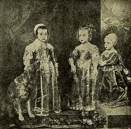 Let us look at their clothes. This picture is a copy of a fine painting in rich colors. If we could go to the big gallery where the painting hangs, we should see that Mary, the sister, is dressed in beautiful white satin; Charles, the elder brother, has on an elegant scarlet gown; while the dear little baby, James, wears a dainty blue gown. The quaint, rich dresses of stiff, costly goods, covered with fine needle-work, would convince us that these are not ordinary children. Indeed, they are the children of a great king.