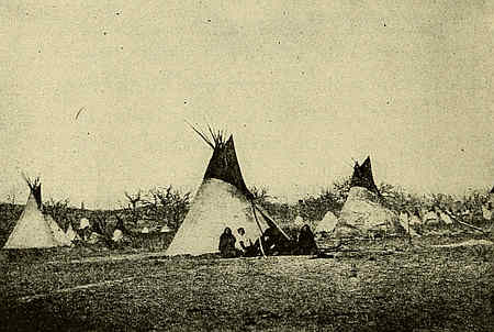 Only Indians had been living here up to that time. These red men wandered about from place to place, stopping when they pleased, now here, now there, wherever they could find plenty to eat for a time. When they came to a place where they wished to camp, they would cut some poles, stand them up, and cover them with skins to form tents. This picture of a Comanche Indian Camp (1343) shows how an[12] Indian village looks. The Arapahoe Indian Camp (1342) gives a nearer view of one of the tents, and we can see how the skins are pieced together and stretched to make a covering.