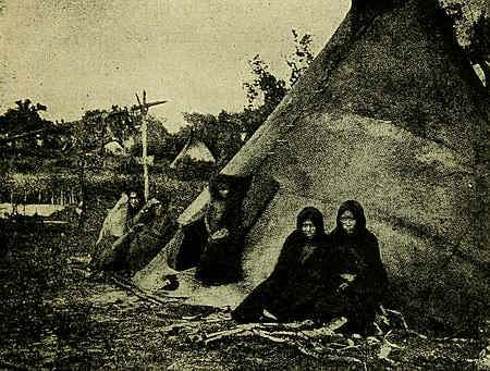 In both pictures are shown some of the Indians themselves wrapped in their blankets. In the second picture at the opening of the tent we see a little Indian child with no blanket on. A short distance[13] away there is a fresh skin hung over a pole to dry.