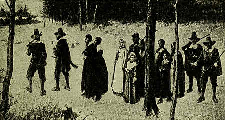 Have you noticed that in all of the pictures in which it has been possible to put a Bible, the different painters have given the Book a prominent place? Do you understand why? Because the noble Pilgrims had great love for God. They lived a life of loyal trust in him. Not only on Sundays, but every day they loved to read the Bible and pray. And so that they might pray to God and serve him as they wished they gave up kind friends and comfortable[24] homes and risked their very lives. We should not think a picture of our Pilgrim forefathers good unless it made us think as soon as we saw it of this part of their lives.