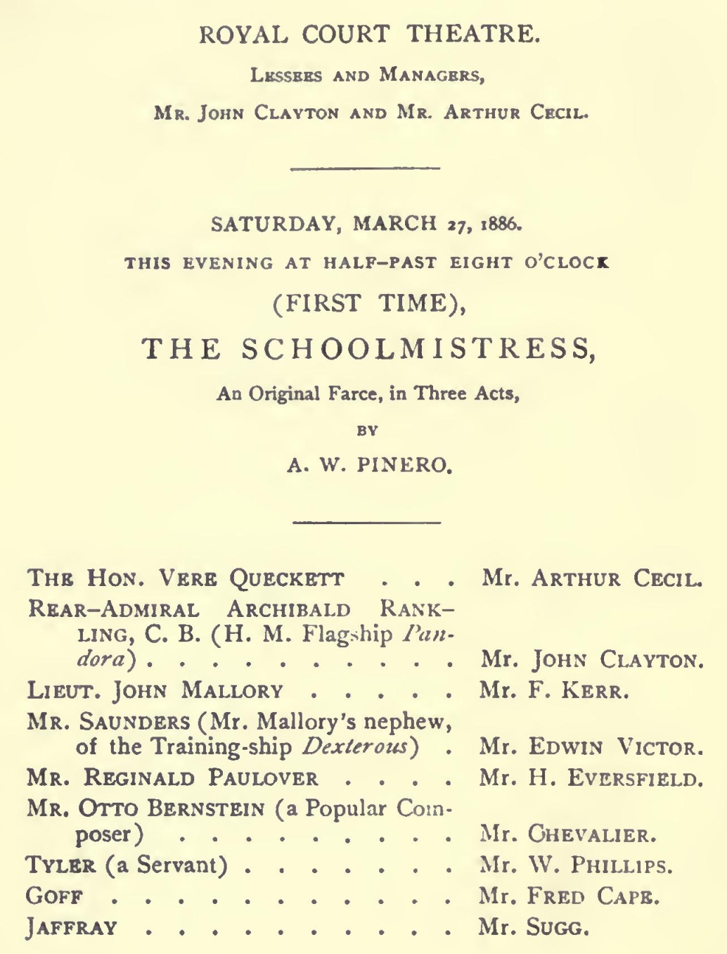 When, during the season of 1885, the exceptional success of "The Magistrate" had revived the fortunes of the Court Theatre and included that house once again among the popular places of entertainment, the future policy of Messrs. John Clayton and Arthur Cecil's management was practically determined. The essentially comic play, the farce of character and manners, was henceforth to compose the programme, and Mr. Pinero, who had suggested the new policy, and so happily inaugurated it, was naturally commissioned to provide the next play. "The Schoolmistress" was accordingly forthcoming in due time, and in the composition of this piece the author further developed his ideas as to the scope and meaning of modern farce, ideas which will be found briefly expounded in my introductory note to "The Cabinet Minister," published in the present series of Mr. Pinero's plays. "The Schoolmistress" has a very simple stage-history. It was produced at the old Court Theatre on March 27, 1886, and it immediately caught the laughter and applause of the town, the success being so decided that the play retained its place in the programme until January 22, 1887, the total number of performances in the interval having amounted to 290.