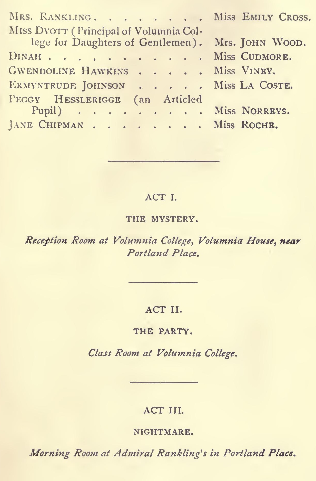 The Scene is the Reception Room at Miss Dyott's seminary for young ladies, known as Volumnia College, Volumnia House, near Portland Place. The windows look on to the street, and a large door at the further end of the room opens to the hall, where there are some portmanteaus standing, while there is another door on the spectator's right. Jane Chipman, a stout, middle-aged servant, and Tyler, an unhealthy looking youth, wearing a page's jacket, enter the room, carrying between them a large travelling-trunk.
