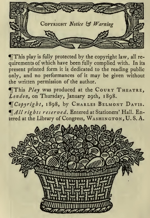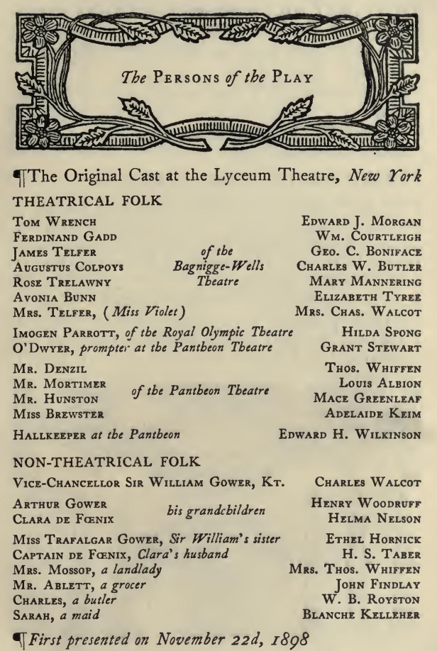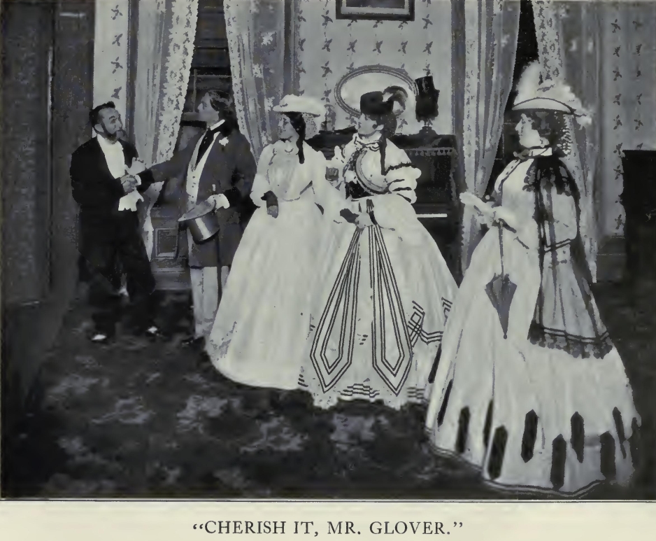 The costumes and scenic decoration of this little play-should follow, to the closest detail, the mode of the early Sixties, the period, in dress, of crinoline and the peg-top trouser; in furniture, of horsehair and mahogany, and the abominable "walnut -and -rep." No attempt should be made to modify such fashions in illustration, to render them less strange, even less grotesque, to the modern eye. On the contrary, there should be an endeavor to reproduce, perhaps to accentuate, any feature which may now seem particularly quaint and bizarre. Thus, lovely youth should be shown decked uncompromisingly as it was at the time indicated, at the risk (which the author believes to be a slight one) of pointing the chastening moral that, while beauty fades assuredly in its own time, it may appear to succeeding generations not to have been beauty at all.