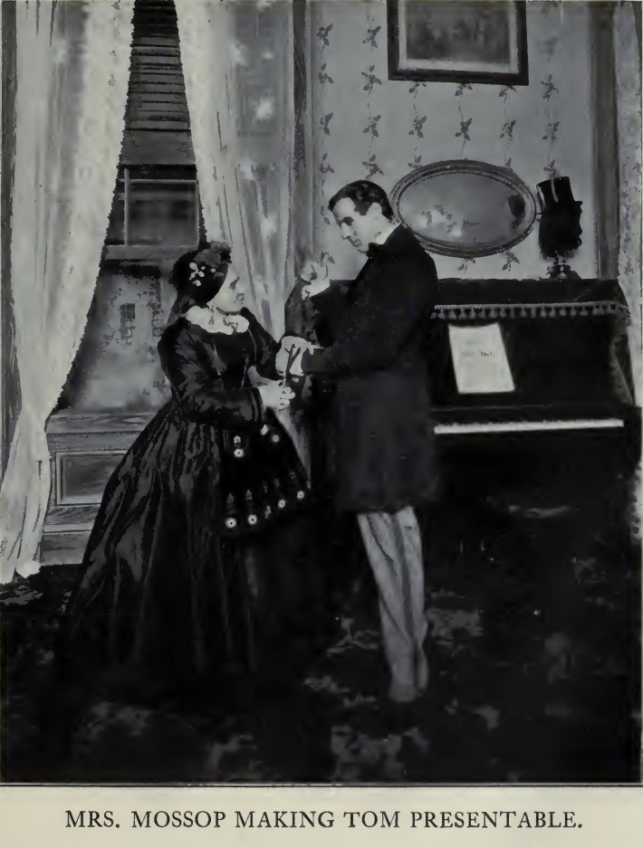 [Tom enters, with a pair of scissors in his hand. He is a shabbily-dressed ungraceful man of about thirty, with a clean-shaven face, curly hair, and eyes full of good-humor.]