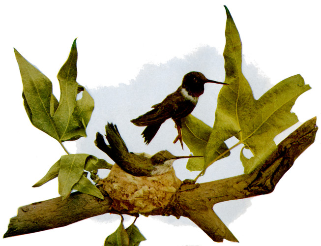 This Hummingbird, which also bears the name Purple-throated and Alexandre’s Hummingbird, is very similar in its habits to our eastern ruby-throat. Even in its call notes and antics while wooing its mate it is almost a counterpart of the eastern species.
