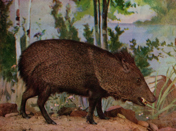 It has been said that the Peccary is totally devoid of fear. It is small, rarely exceeding eighteen inches in height, and yet it is not less dreaded than the most savage Wild Boar would be. Many an unlucky sportsman, to escape a herd of these wild creatures has been glad to climb a tree in time to save his life. Men, Horses, and Dogs fly in haste, for the Peccaries fight like a well drilled army, and by swarming about an enemy they are sure to conquer with their strong, sharp tusks. They avoid conflict with man, and shyly run into the thick woods on his approach, but when fired upon or brought to bay they seem possessed only with rage and desire for vengeance.