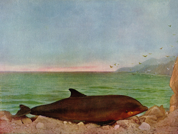 The Bottle-nose Dolphin is one of the best known members of the family. The snout is very long, like a beak, and protrudes from twelve to twenty-four inches. The range of this Dolphin seems to be restricted to the Arctic Ocean and the north of the Atlantic, but it is known to make regular migrations a considerable distance south of it. Occasionally it appears on the coast of Great Britain. Cuttlefish, Mollusks, and small fry compose its food.