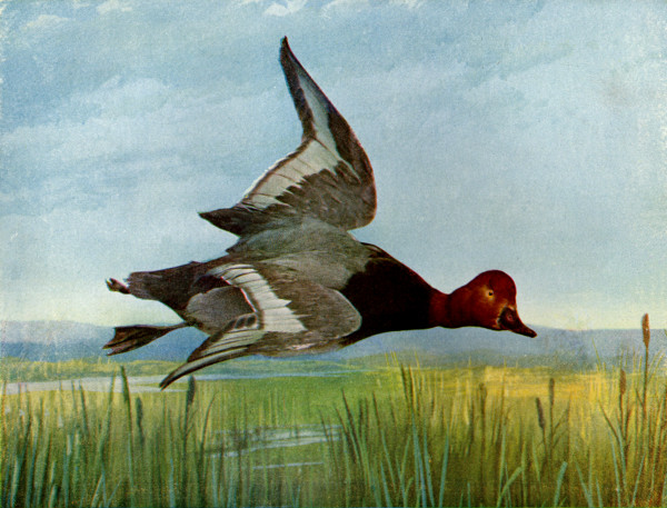 The Red-head is said not to be common along the coast of New England, but in the winter months is found in considerable numbers along the south shore of Long Island. It is extremely abundant south of that point, and particularly so in Chesapeake Bay, where immense numbers are killed each season. Where it is enabled to feed on the well known wild celery its flesh is said to be fully equal in flavor to that of the Canvas Back. Both in spring and fall it is an extremely abundant migrant in the Western States. It generally reaches northern Illinois, says Hallock, in its spring passage about the last of March, remaining until the latter part of April. On its return journey late in October, it remains on the rivers, lakes, and sloughs until the cold weather, by freezing up its feeding grounds, forces it to go farther south. It is altogether probable that a few of these birds breed in the Rocky Mountain regions within the limits of the United States, but they usually continue northward to their regular breeding grounds, which extend from Wisconsin, Michigan, and others of the northern tier of states, to the fur countries.