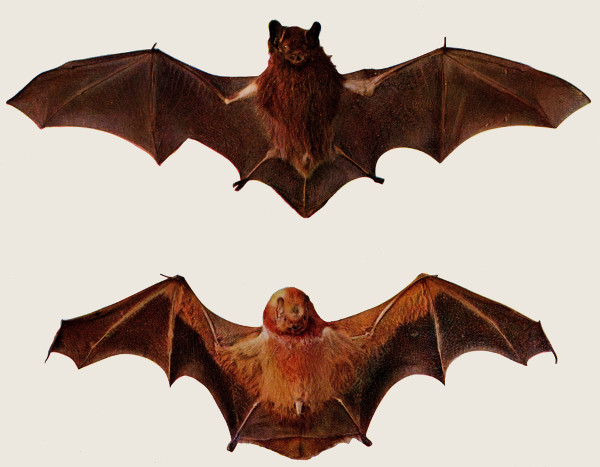 The sub-order of smooth-nosed Bats is represented in this country by several species peculiar to America. The most common in all the Atlantic coast states is the Red Bat, or New York Bat, which is a busy hunter of flying insects, which it follows so persistently that it frequently flies into rooms in pursuit of its favorite prey. It flies rather slowly, but it changes the direction of its flight very rapidly, and its movements in the air are very graceful. Besides this species is the Black Bat, and several others have been observed and described, but so far the descriptions, according to Brehm, have been principally technical, and little or nothing is known of their habits, except that no North American species seems to be harmful, but the contrary, as they are all insect-eaters.
