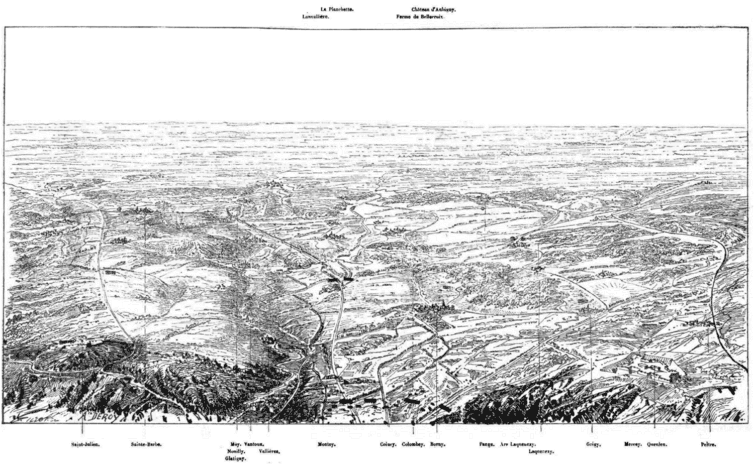Les corps Decaen et Ladmirault couvraient l'espace compris entre les villages de Grigy à droite et de Mey à gauche. Le terrain qu'elles occupaient forme un plateau à arêtes indécises légèrement incliné vers la Moselle; il est protégé en avant et sur la droite par le ravin de Vallières, dont le fond, rempli d'une eau stagnante, constitue un obstacle d'autant plus sérieux que la disposition des pentes y est des plus favorables à l'action du chassepot et de la mitrailleuse, surtout dans la zone comprise entre Lauvallière et la Planchette, par laquelle débouchent les deux routes de Sarrelouis et de Sarrebruck. Sur la gauche, occupée par la division Grenier, entre Mey et Nouilly, le terrain forme un vaste plateau fortement ondulé qui s'élève insensiblement du fort Saint-Julien jusqu'au village de Sainte-Barbe, situé à six kilomètres plus loin et dont le clocher très-élevé se dresse comme un obélisque à l'horizon. La position française était coupée longitudinalement par le ravin escarpé de Vallières, qui se bifurque à hauteur de Mey; l'une des branches se dirige droit sur Nouilly, l'autre tourne à droite en formant un coude brusque dans la direction du château de Colombey.