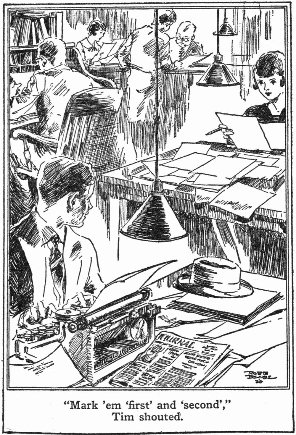 Every one worked. Gertie flew about. Miss Betty showed Joan how to copy one side of a club program and then paste the other side to save copying it. Tim breathed new life into the usually dead rewrites. Mack was pounding out the day’s ball scores. Cookie was doing the obits. Chub trotted his legs almost off, running to the composing room with copy. Dummy was there, directing things from his stool, above the tinkle of the linotype machines. Every one seemed used to his having a voice, already. Joan had no time to think of the mystery or to do more than wonder about Dummy, not even when Chub confided to her that he had somehow discovered that it was Bossy who had hid the charity play story.
