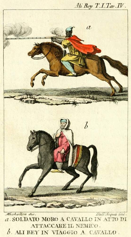 Nelle guerre d'Affrica il fantaccino non ha veruna considerazione, di modo che le forze [22] d'ogni potentato viene calcolata sul numero de' loro cavalli, e per tale ragione i Mori si esercitano principalmente nel cavalcare. A Tanger fannosi tali esercizj lungo la spiaggia, facendo correre i cavalli sull'arena ancor bagnata dalla bassa marea. Con questi continuati esercizj si rendono eccellenti cavalieri. Adoperano selle assai pesanti, con arcioni altissimi assicurati sul cavallo da due cinghie che serrano il cavallo, una passandogli sotto le coste, e l'altra obbliquamente per i fianchi sotto il basso ventre. Hanno cortissime staffe per montare, ed i loro speroni sono formati da due ferri appuntati lunghi circa otto pollici. Con questo equipaggio, e con un morso durissimo martirizzano talmente i poveri cavalli, che frequentemente spargono sangue dai fianchi e dalla bocca.