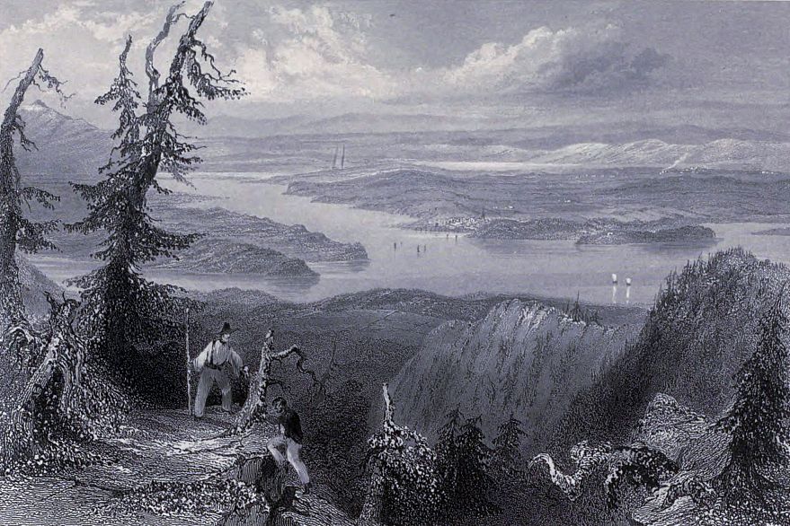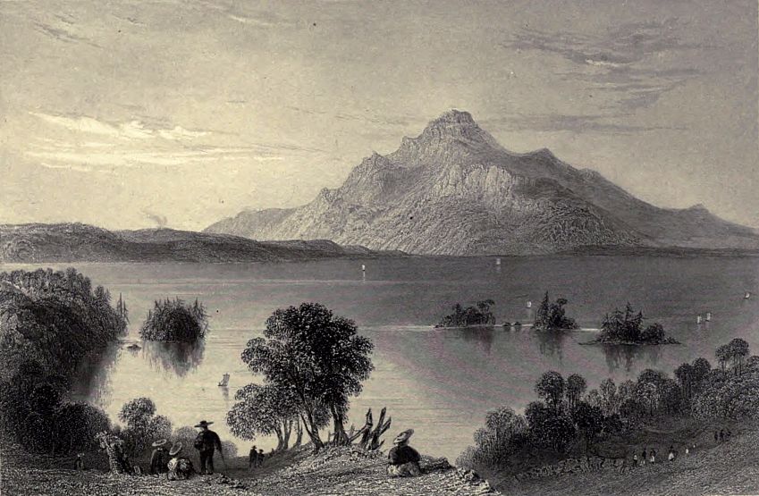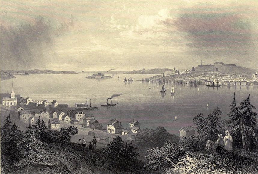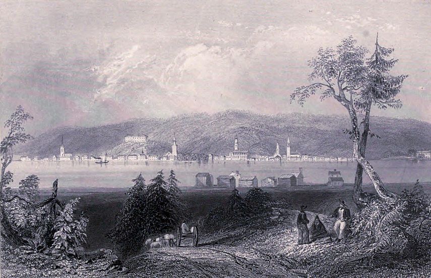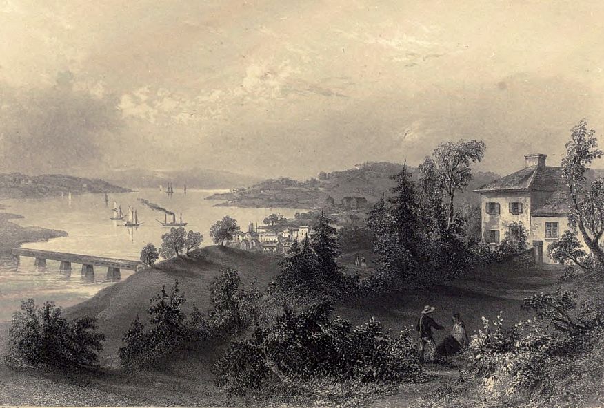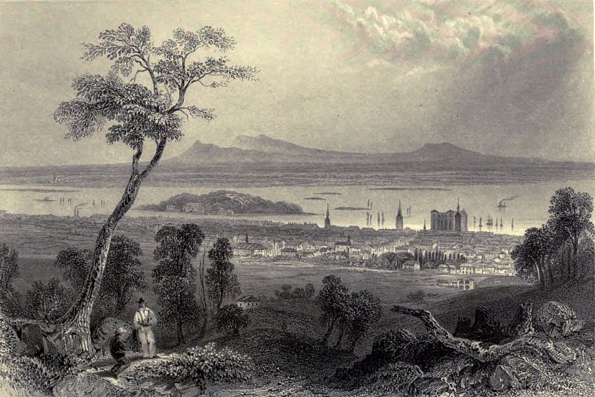 The site of this town does not present those bold and grand features which distinguish the Canadian metropolis, though its beauty can scarcely be surpassed. The river, in this finest part of its course, divides itself into two channels, inclosing an island thirty-two miles long and ten and a half broad, which forms one of the most favoured spots on earth. The soil, everywhere luxuriant, is cultivated like one great garden, to supply the inhabitants with vegetables and fruit. These last are of the finest quality, and the apples especially are said to display that superiority which so remarkably distinguishes them in the New World. Although the island possesses in general that level surface that fits it for a thorough cultivation, yet about a mile and a half north-east rises a hill, 550 feet high, commanding a noble view over the fertile country, which is watered by the several branches and tributaries of the St. Lawrence. Its face is covered with agreeable villas, and its wooded heights form a frequent resort to pleasure parties from the city; but the intention now understood to be entertained of erecting fortifications on its summit, will, if put into execution, banish in a great measure its rural character.