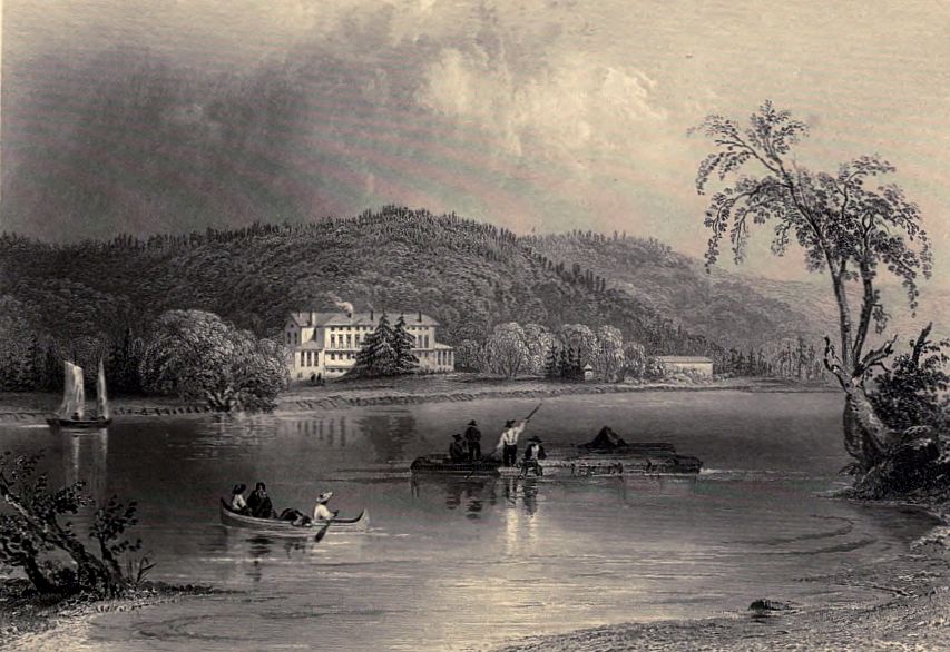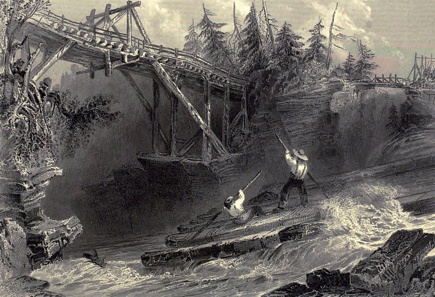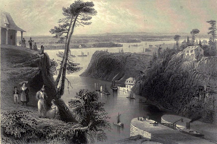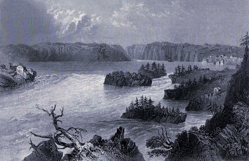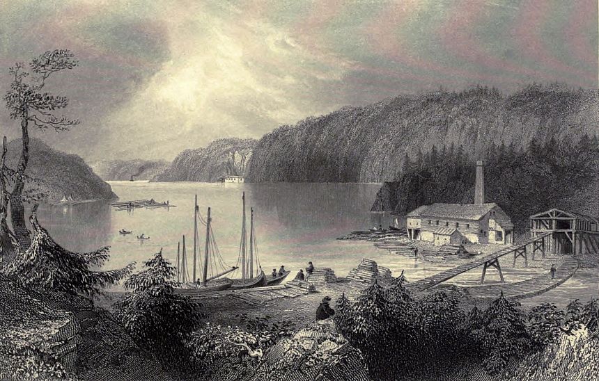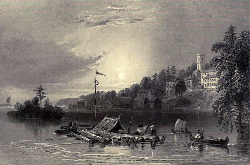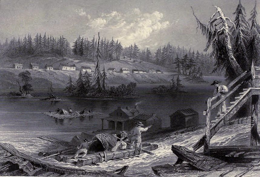 For ten miles downwards the stream is beautifully diversified by wooded islands, through which it rushes with various degrees of violence. The banks, great part of the way, consist of white marble, somewhat soft and coarse; but farther inland, it is believed, a superior description would be found. At the end of this tract, Bisset’s chantier, a solitary log-house, with a few cleared acres, relieves the eye after the monotony of these vast solitudes; it affords also a welcome asylum to the fur and timber traders. Soon after, the view opens upon the magnificent expanse of the Lake des Chats, about fifteen miles long, studded with richly-wooded islets. On the south are one or two scattered mansions, and particularly Kinnell Lodge, the residence of the Highland chieftain, McNab. The northern side appears uninhabited; yet at a little distance from the beach is the settlement of Clarendon, formed in 1829, and in 1831 containing 257 inhabitants. The township of Bristol, in 1828, presented only a few poor hovels and 31 settlers, which number had, in 1831, increased to 96, and in 1836 to not less than 445. At length the lake suddenly contracts, and the rapids of the Chats, for three miles, dash in violent eddies, amid a labyrinth of islands. They terminate in the Falls des Chats, fifteen or sixteen in number, extending in a curved line across the river, and divided by wooded islands; but only from sixteen to twenty feet high. The northern coast, having a rocky and uneven surface, forms the township of Onslow, which in 1836 had 150 settlers.