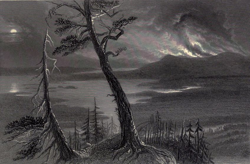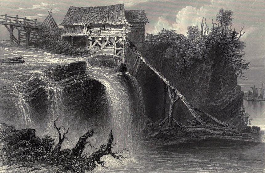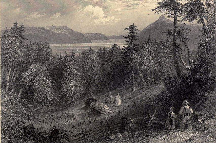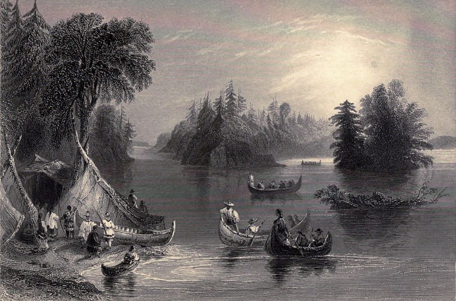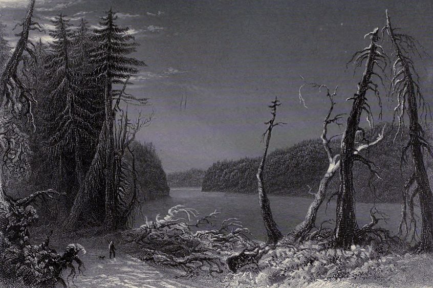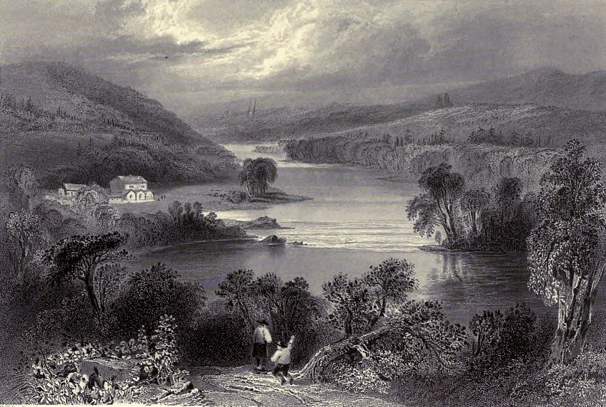 For ten miles downwards the stream is beautifully diversified by wooded islands, through which it rushes with various degrees of violence. The banks, great part of the way, consist of white marble, somewhat soft and coarse; but farther inland, it is believed, a superior description would be found. At the end of this tract, Bisset’s chantier, a solitary log-house, with a few cleared acres, relieves the eye after the monotony of these vast solitudes; it affords also a welcome asylum to the fur and timber traders. Soon after, the view opens upon the magnificent expanse of the Lake des Chats, about fifteen miles long, studded with richly-wooded islets. On the south are one or two scattered mansions, and particularly Kinnell Lodge, the residence of the Highland chieftain, McNab. The northern side appears uninhabited; yet at a little distance from the beach is the settlement of Clarendon, formed in 1829, and in 1831 containing 257 inhabitants. The township of Bristol, in 1828, presented only a few poor hovels and 31 settlers, which number had, in 1831, increased to 96, and in 1836 to not less than 445. At length the lake suddenly contracts, and the rapids of the Chats, for three miles, dash in violent eddies, amid a labyrinth of islands. They terminate in the Falls des Chats, fifteen or sixteen in number, extending in a curved line across the river, and divided by wooded islands; but only from sixteen to twenty feet high. The northern coast, having a rocky and uneven surface, forms the township of Onslow, which in 1836 had 150 settlers.